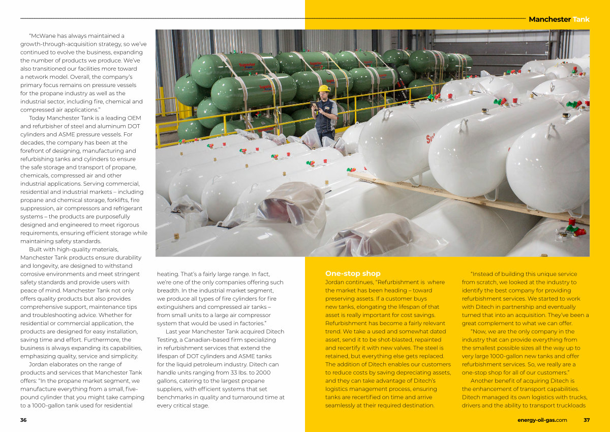 Jordan elaborates on the range of products and services that Manchester Tank offers:“ In the propane market segment, we manufacture everything from a small, fivepound cylinder that you might take camping to a 1000-gallon tank used for residential