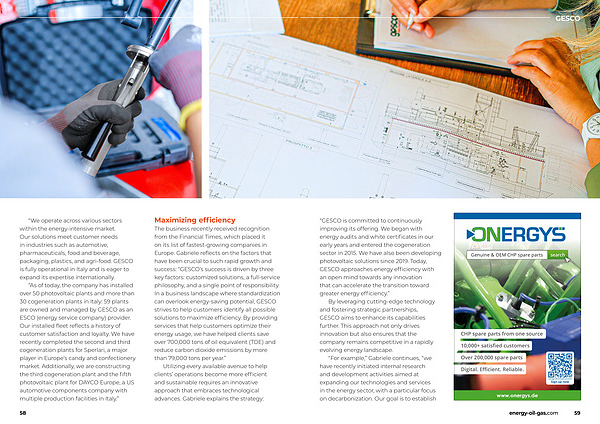 The business recently received recognition from the Financial Times, which placed it on its list of fastest-growing companies in Europe. Gabriele reflects on the factors that have been crucial to such rapid growth and success:“ GESCO’ s success is driven by three key factors: customized solutions, a full-service philosophy, and a single point of responsibility. In a business landscape where standardization can overlook energy-saving potential, GESCO strives to help customers identify all possible solutions to maximize efficiency. By providing services that help customers optimize their energy usage, we have helped clients save over 700,000 tons of oil equivalent( TOE) and reduce carbon dioxide emissions by more than 79,000 tons per year.”