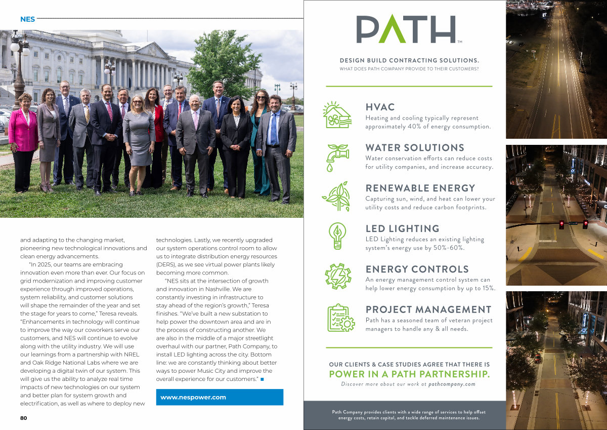 “ NES sits at the intersection of growth and innovation in Nashville. We are constantly investing in infrastructure to stay ahead of the region’ s growth,” Teresa finishes.“ We’ ve built a new substation to help power the downtown area and are in the process of constructing another. We are also in the middle of a major streetlight overhaul with our partner, Path Company, to install LED lighting across the city. Bottom line: we are constantly thinking about better ways to power Music City and improve the overall experience for our customers.” ■