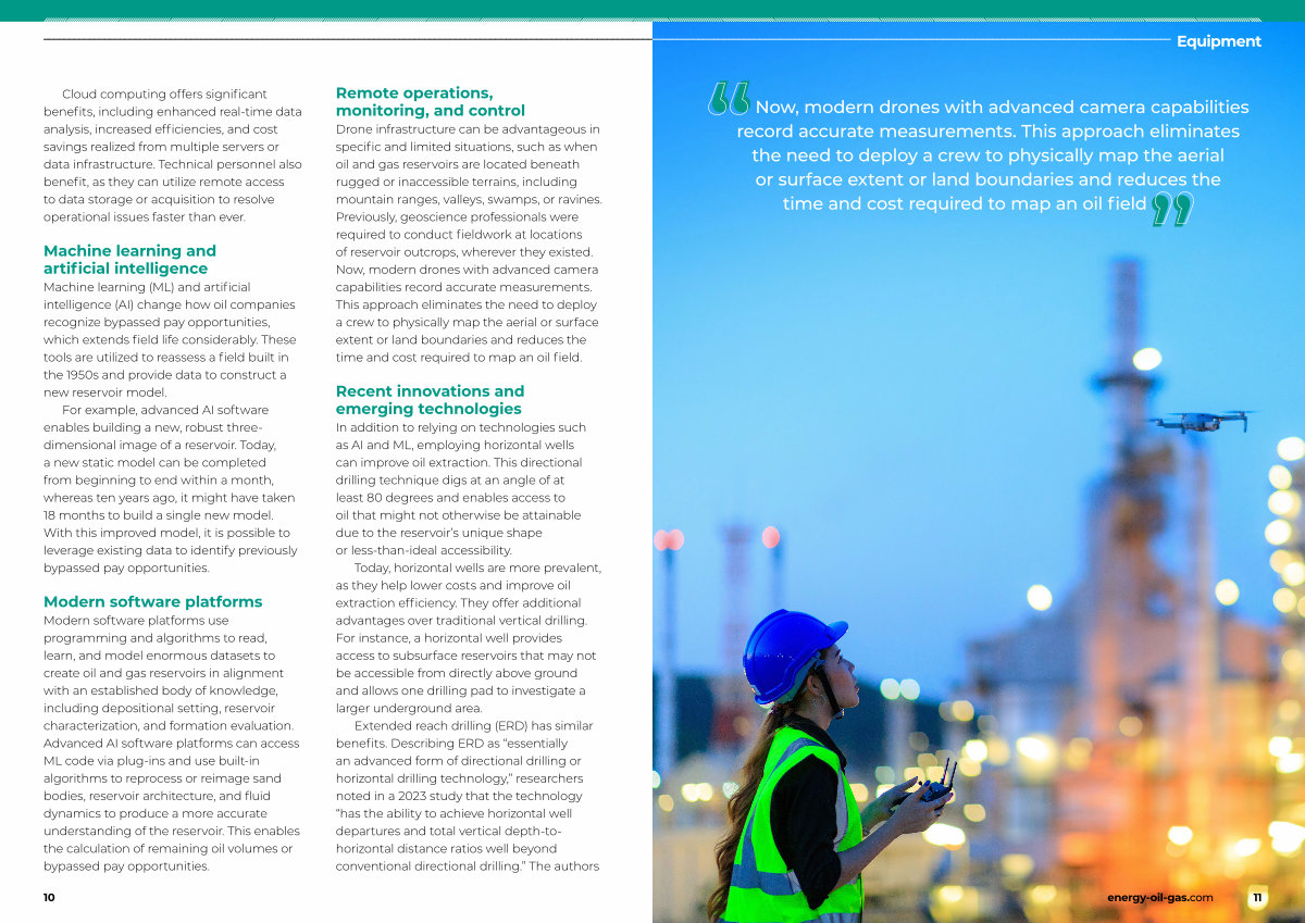 For example, advanced AI software enables building a new, robust threedimensional image of a reservoir. Today, a new static model can be completed from beginning to end within a month, whereas ten years ago, it might have taken 18 months to build a single new model. With this improved model, it is possible to leverage existing data to identify previously bypassed pay opportunities.