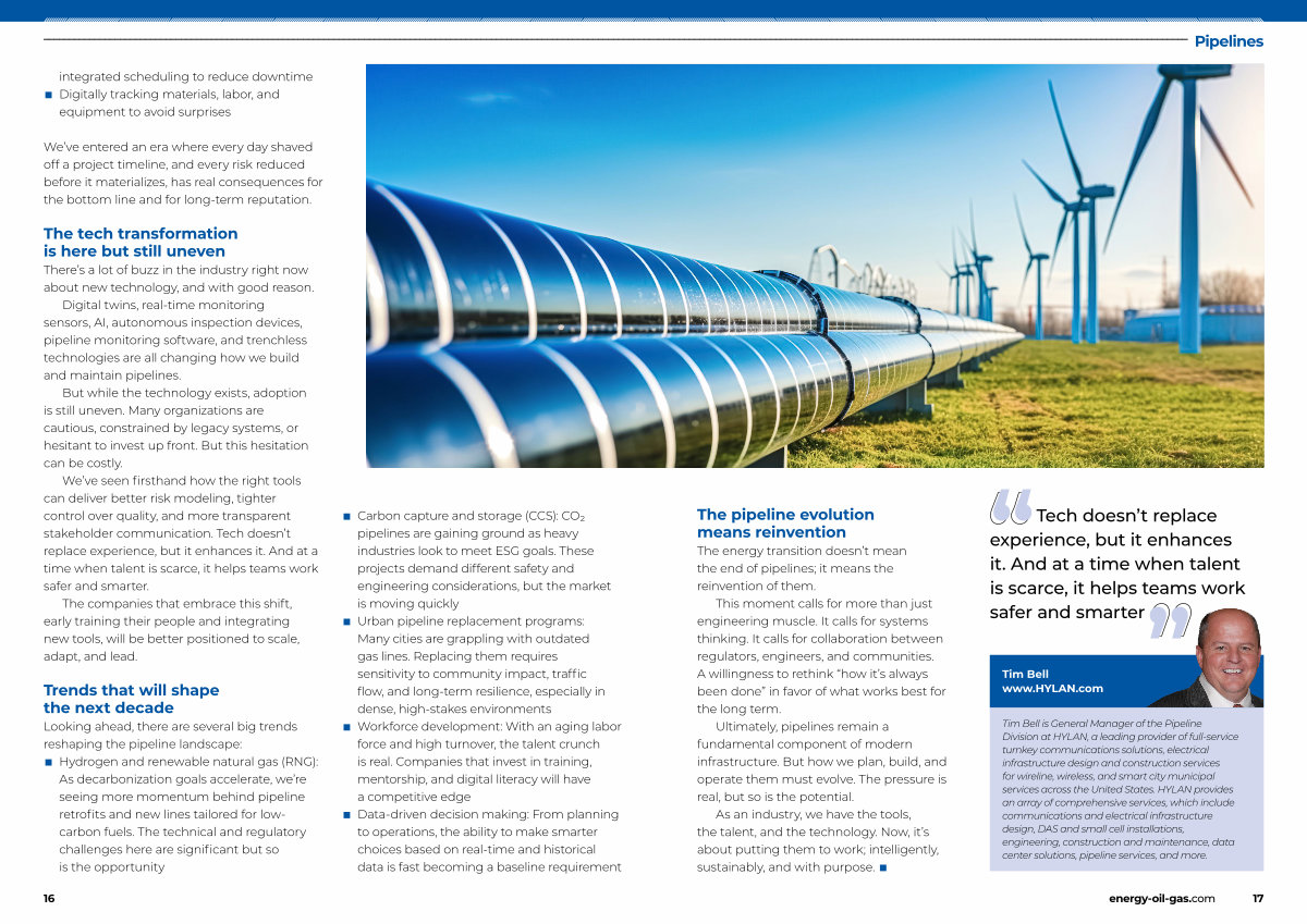 Tim Bell is General Manager of the Pipeline Division at HYLAN, a leading provider of full-service turnkey communications solutions, electrical infrastructure design and construction services for wireline, wireless, and smart city municipal services across the United States. HYLAN provides an array of comprehensive services, which include communications and electrical infrastructure design, DAS and small cell installations, engineering, construction and maintenance, data center solutions, pipeline services, and more.
