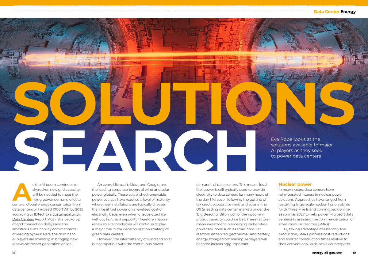 Eve demands of data centers. This means fossil fuel power is still typically used to provide electricity to data centers for many hours of the day. Moreover, following the gutting of tax credit support for wind and solar in the US( a leading data center market) under the‘ Big Beautiful Bill’, much of the upcoming project capacity could be lost. These factors mean investment in emerging carbon-free power solutions such as small modular reactors, enhanced geothermal, and battery energy storage from leading AI players will become increasingly important.