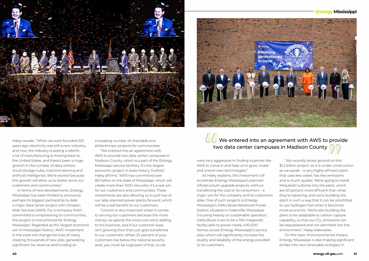 “ We entered into an agreement with AWS to provide two data center campuses in Madison County, which is a part of the Entergy Mississippi service territory. It’ s the largest economic project in state history, fivefold,” Haley affirms.“ AWS has committed over $ 10 billion to the state of Mississippi, which will create more than 1000 new jobs: it’ s a real win for our customers and communities. These investments are also allowing us to pull two of our later-planned power plants forward, which will be a real benefit to our customers.