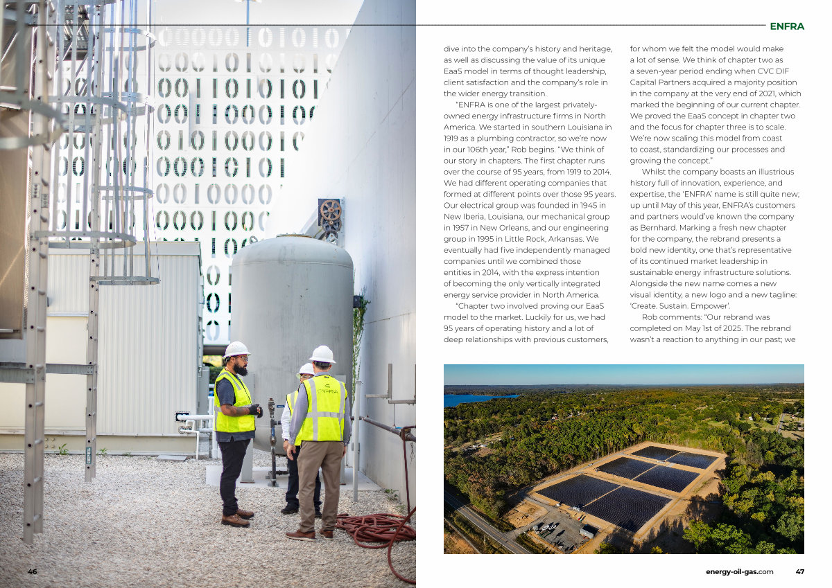 “ ENFRA is one of the largest privatelyowned energy infrastructure firms in North America. We started in southern Louisiana in 1919 as a plumbing contractor, so we’ re now in our 106th year,” Rob begins.“ We think of our story in chapters. The first chapter runs over the course of 95 years, from 1919 to 2014. We had different operating companies that formed at different points over those 95 years. Our electrical group was founded in 1945 in New Iberia, Louisiana, our mechanical group in 1957 in New Orleans, and our engineering group in 1995 in Little Rock, Arkansas. We eventually had five independently managed companies until we combined those entities in 2014, with the express intention of becoming the only vertically integrated energy service provider in North America.