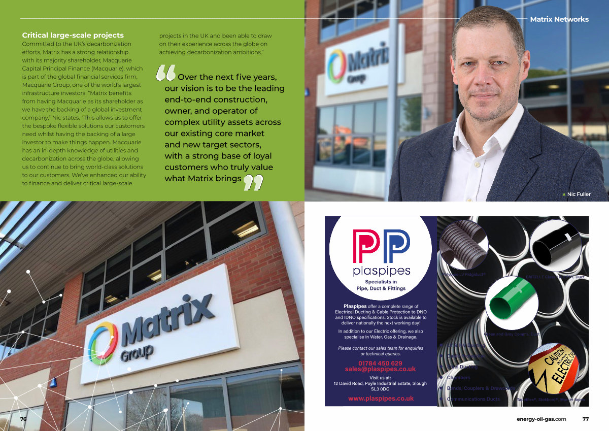 Committed to the UK’ s decarbonization efforts, Matrix has a strong relationship with its majority shareholder, Macquarie Capital Principal Finance( Macquarie), which is part of the global financial services firm, Macquarie Group, one of the world’ s largest infrastructure investors.“ Matrix benefits from having Macquarie as its shareholder as we have the backing of a global investment company,” Nic states.“ This allows us to offer the bespoke flexible solutions our customers need whilst having the backing of a large investor to make things happen. Macquarie has an in-depth knowledge of utilities and decarbonization across the globe, allowing us to continue to bring world-class solutions to our customers. We’ ve enhanced our ability to finance and deliver critical large-scale projects in the UK and been able to draw on their experience across the globe on achieving decarbonization ambitions.”