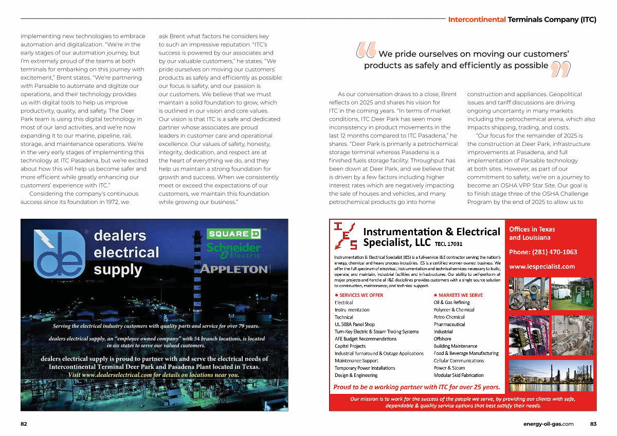 new technologies to embrace automation and digitalization.“ We’ re in the early stages of our automation journey, but I’ m extremely proud of the teams at both terminals for embarking on this journey with excitement,” Brent states.“ We’ re partnering with Parsable to automate and digitize our operations, and their technology provides us with digital tools to help us improve productivity, quality, and safety. The Deer Park team is using this digital technology in most of our land activities, and we’ re now expanding it to our marine, pipeline, rail, storage, and maintenance operations. We’ re in the very early stages of implementing this technology at ITC Pasadena, but we’ re excited about how this will help us become safer and more efficient while greatly enhancing our customers’ experience with ITC.”