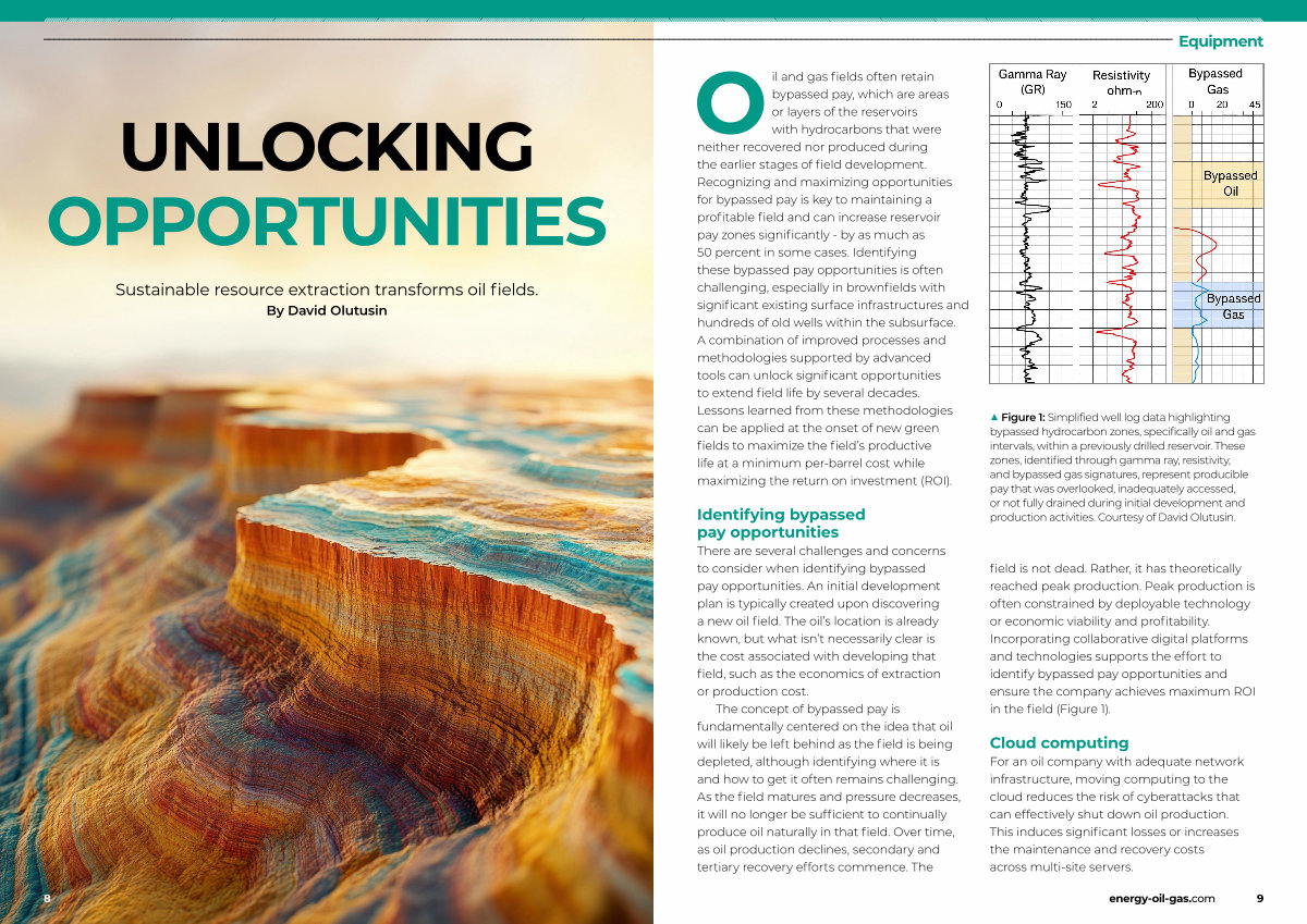 ▲ Figure 1: Simplified well log data highlighting bypassed hydrocarbon zones, specifically oil and gas intervals, within a previously drilled reservoir. These zones, identified through gamma ray, resistivity, and bypassed gas signatures, represent producible pay that was overlooked, inadequately accessed, or not fully drained during initial development and production activities. Courtesy of David Olutusin.