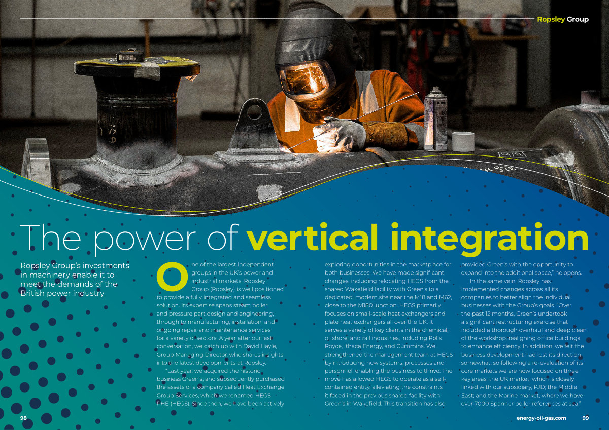 exploring opportunities in the marketplace for both businesses. We have made significant changes, including relocating HEGS from the shared Wakefield facility with Green’ s to a dedicated, modern site near the M18 and M62, close to the M180 junction. HEGS primarily focuses on small-scale heat exchangers and plate heat exchangers all over the UK. It serves a variety of key clients in the chemical, offshore, and rail industries, including Rolls Royce, Ithaca Energy, and Cummins. We strengthened the management team at HEGS by introducing new systems, processes and personnel, enabling the business to thrive. The move has allowed HEGS to operate as a selfcontained entity, alleviating the constraints it faced in the previous shared facility with Green’ s in Wakefield. This transition has also provided Green’ s with the opportunity to expand into the additional space,” he opens.