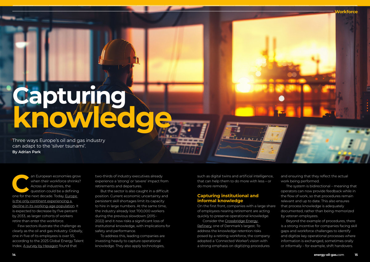 Consider the Crossbridge Energy Refinery, one of Denmark’ s largest. To address the knowledge retention risks posed by a retiring workforce, the company adopted a‘ Connected Worker \ vision with a strong emphasis on digitizing procedures and ensuring that they reflect the actual work being performed.