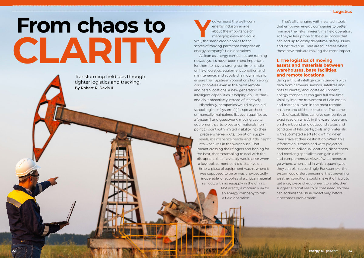 Historically, companies would rely on oldschool logistics‘ systems’( if a spreadsheet or manually maintained list even qualifies as a‘ system’) and guesswork, moving capital equipment, parts, pipes and materials from point to point with limited visibility into their precise whereabouts, condition, supply levels, maintenance needs, and little insight into what was in the warehouse. That meant crossing their fingers and hoping for the best, then scrambling to deal with the disruptions that inevitably would arise when a key replacement part didn’ t arrive on time, a piece of equipment wasn’ t where it was supposed to be or was unexpectedly inoperable, or supplies of a critical material ran out, with no resupply in the offing. Not exactly a modern way for an energy company to run a field operation.