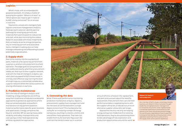 What if field asset performance monitoring, predictive maintenance analytics, logistics, procurement, supply chain management and the like were all connected within a single digital environment? This has become the reality for an increasing number of energy companies, resulting in a holistic, end-to-end view of their field operations. That view can enable them to, for example, flag a part like a drill bit that tends to wear out in a certain
