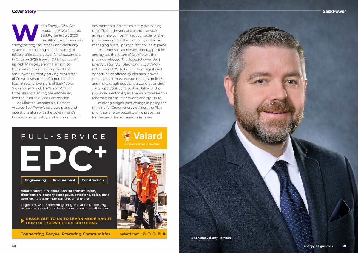 When Energy, Oil & Gas magazine( EOG) featured SaskPower in July 2025, the utility was focusing on strengthening Saskatchewan’ s electricity system and ensuring a stable supply of reliable, affordable power for all customers. In October 2025 Energy, Oil & Gas caught up with Minister Jeremy Harrison, to learn about recent developments at SaskPower. Currently serving as Minister of Crown Investments Corporation, he has ministerial oversight of SaskPower, SaskEnergy, SaskTel, SGI, SaskWater, Lotteries and Gaming Saskatchewan, and the Public Service Commission.
