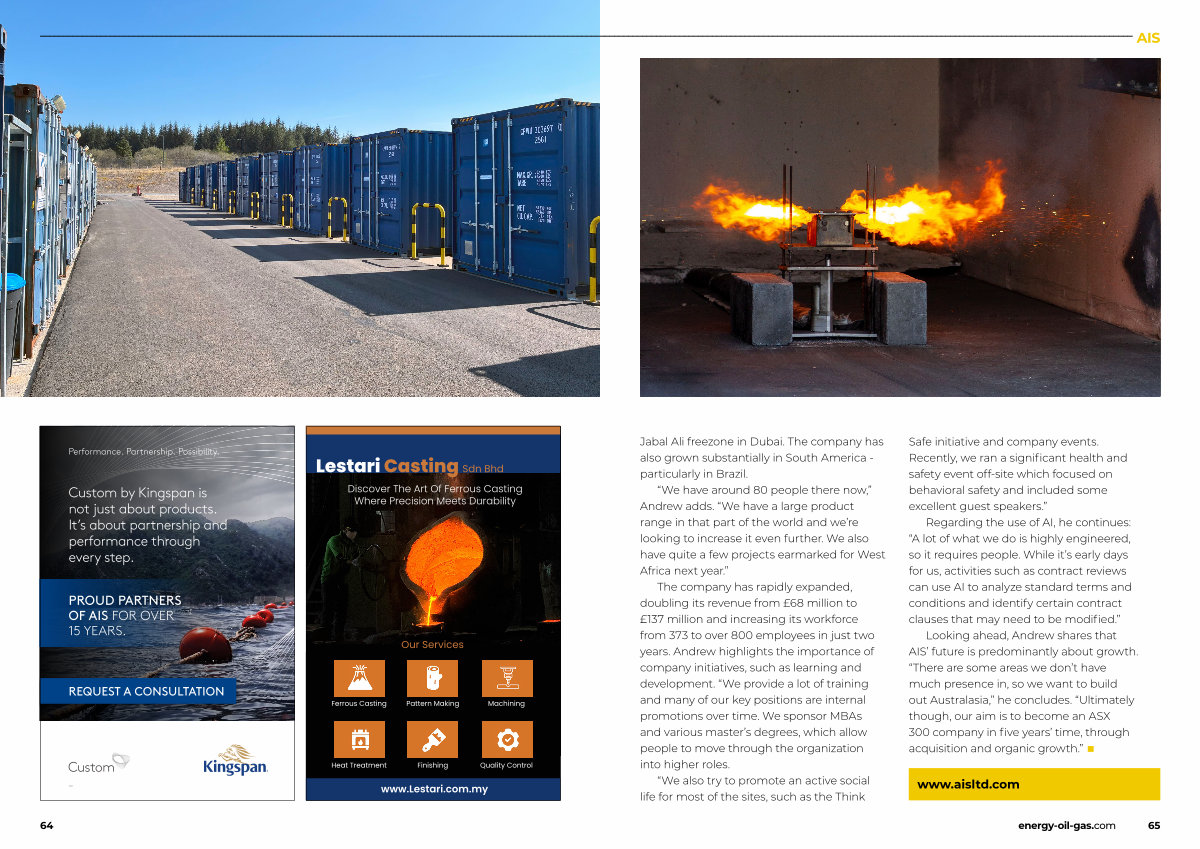 Looking ahead, Andrew shares that AIS’ future is predominantly about growth.“ There are some areas we don’ t have much presence in, so we want to build out Australasia,” he concludes.“ Ultimately though, our aim is to become an ASX 300 company in five years’ time, through acquisition and organic growth.” ■