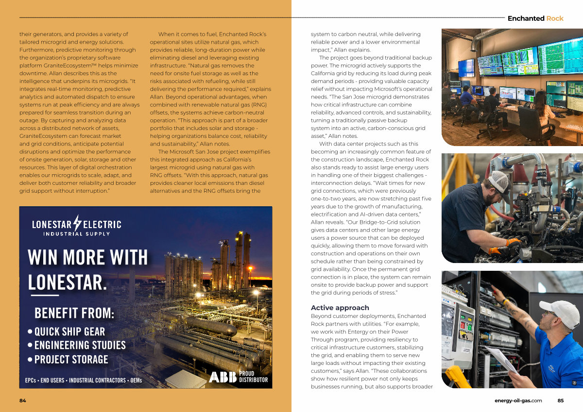With data center projects such as this becoming an increasingly common feature of the construction landscape, Enchanted Rock also stands ready to assist large energy users in handling one of their biggest challenges- interconnection delays.“ Wait times for new grid connections, which were previously one-to-two years, are now stretching past five years due to the growth of manufacturing, electrification and AI-driven data centers,” Allan reveals.“ Our Bridge-to-Grid solution gives data centers and other large energy users a power source that can be deployed quickly, allowing them to move forward with construction and operations on their own schedule rather than being constrained by grid availability. Once the permanent grid connection is in place, the system can remain onsite to provide backup power and support the grid during periods of stress.”