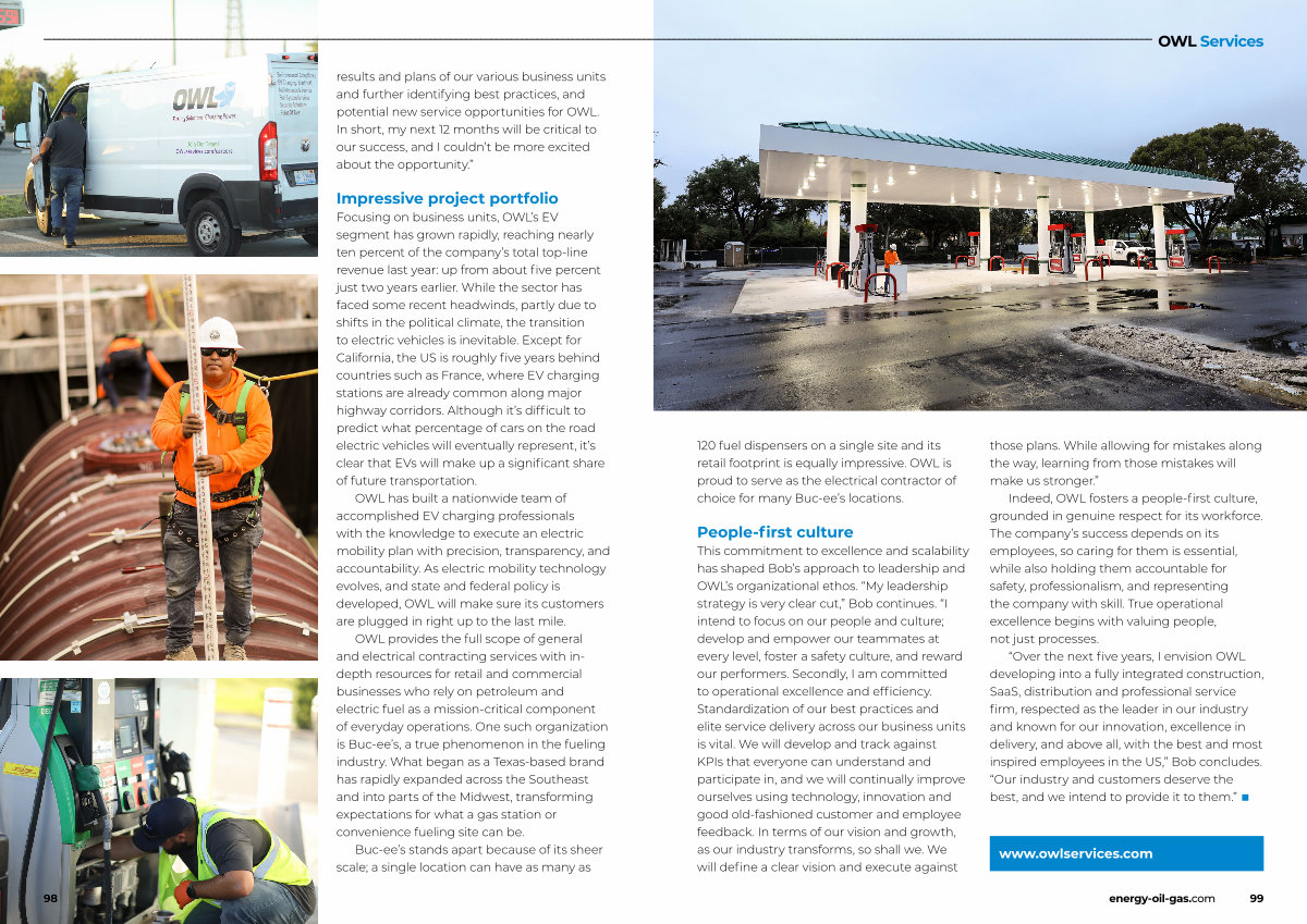 This commitment to excellence and scalability has shaped Bob’ s approach to leadership and OWL’ s organizational ethos.“ My leadership strategy is very clear cut,” Bob continues.“ I intend to focus on our people and culture; develop and empower our teammates at every level, foster a safety culture, and reward our performers. Secondly, I am committed to operational excellence and efficiency. Standardization of our best practices and elite service delivery across our business units is vital. We will develop and track against KPIs that everyone can understand and participate in, and we will continually improve ourselves using technology, innovation and good old-fashioned customer and employee feedback. In terms of our vision and growth, as our industry transforms, so shall we. We will define a clear vision and execute against those plans. While allowing for mistakes along the way, learning from those mistakes will make us stronger.”