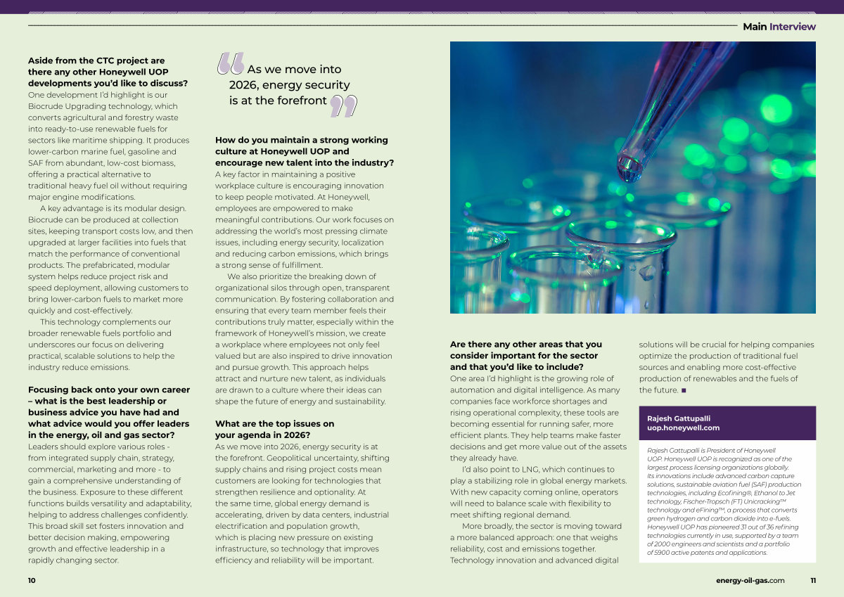 Aside from the CTC project are there any other Honeywell UOP developments you’ d like to discuss? One development I’ d highlight is our Biocrude Upgrading technology, which converts agricultural and forestry waste into ready-to-use renewable fuels for sectors like maritime shipping. It produces lower-carbon marine fuel, gasoline and SAF from abundant, low-cost biomass, offering a practical alternative to traditional heavy fuel oil without requiring major engine modifications.