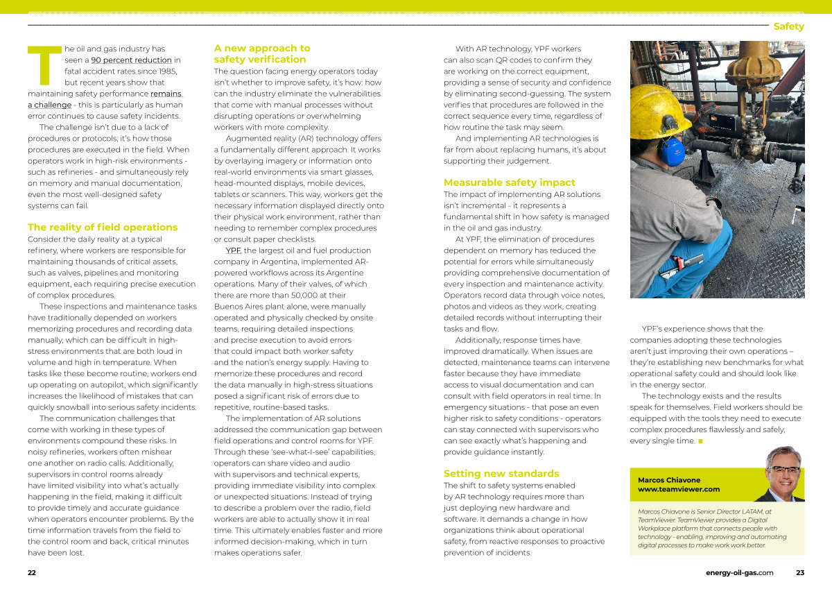 YPF, the largest oil and fuel production company in Argentina, implemented ARpowered workflows across its Argentine operations. Many of their valves, of which there are more than 50,000 at their Buenos Aires plant alone, were manually operated and physically checked by onsite teams, requiring detailed inspections and precise execution to avoid errors that could impact both worker safety and the nation’ s energy supply. Having to memorize these procedures and record the data manually in high-stress situations posed a significant risk of errors due to repetitive, routine-based tasks.