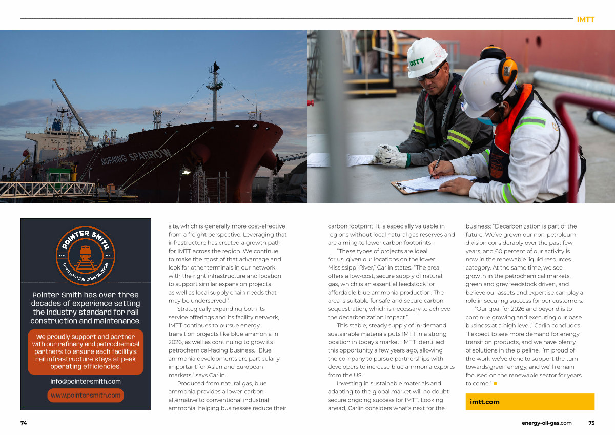 Strategically expanding both its service offerings and its facility network, IMTT continues to pursue energy transition projects like blue ammonia in 2026, as well as continuing to grow its petrochemical-facing business.“ Blue ammonia developments are particularly important for Asian and European markets,” says Carlin.