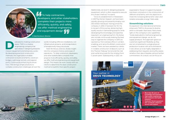 methods , the organization enables contractors to build wind farms , construct bridges , submerge tunnels , and expand ports . Continuously enhancing its knowhow , TWD brings simple solutions to complex construction challenges all over the world , including offshore installations , civil infrastructure projects , and transportation of exceptionally heavy structures .