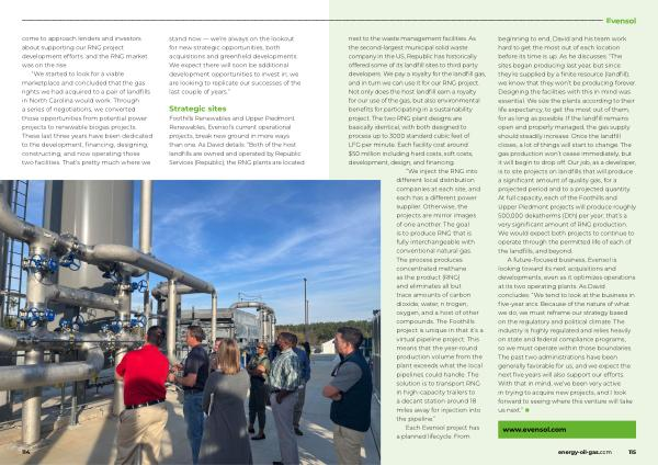 Each Evensol project has a planned lifecycle . From beginning to end , David and his team work hard to get the most out of each location before its time is up . As he discusses : “ The sites began producing last year , but since they ’ re supplied by a finite resource ( landfill ), we know that they won ’ t be producing forever . Designing the facilities with this in mind was essential . We size the plants according to their life expectancy , to get the most out of them , for as long as possible . If the landfill remains open and properly managed , the gas supply should steadily increase . Once the landfill closes , a lot of things will start to change . The gas production won ’ t cease immediately , but it will begin to drop off . Our job , as a developer , is to site projects on landfills that will produce a significant amount of quality gas , for a projected period and to a projected quantity . At full capacity , each of the Foothills and Upper Piedmont projects will produce roughly 500,000 dekatherms ( Dth ) per year ; that ’ s a very significant amount of RNG production . We would expect both projects to continue to operate through the permitted life of each of the landfills , and beyond .